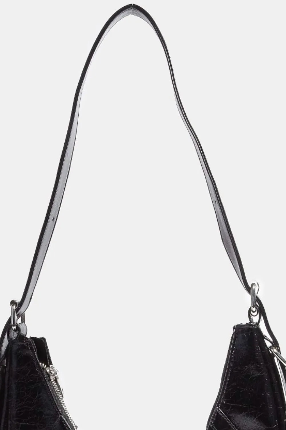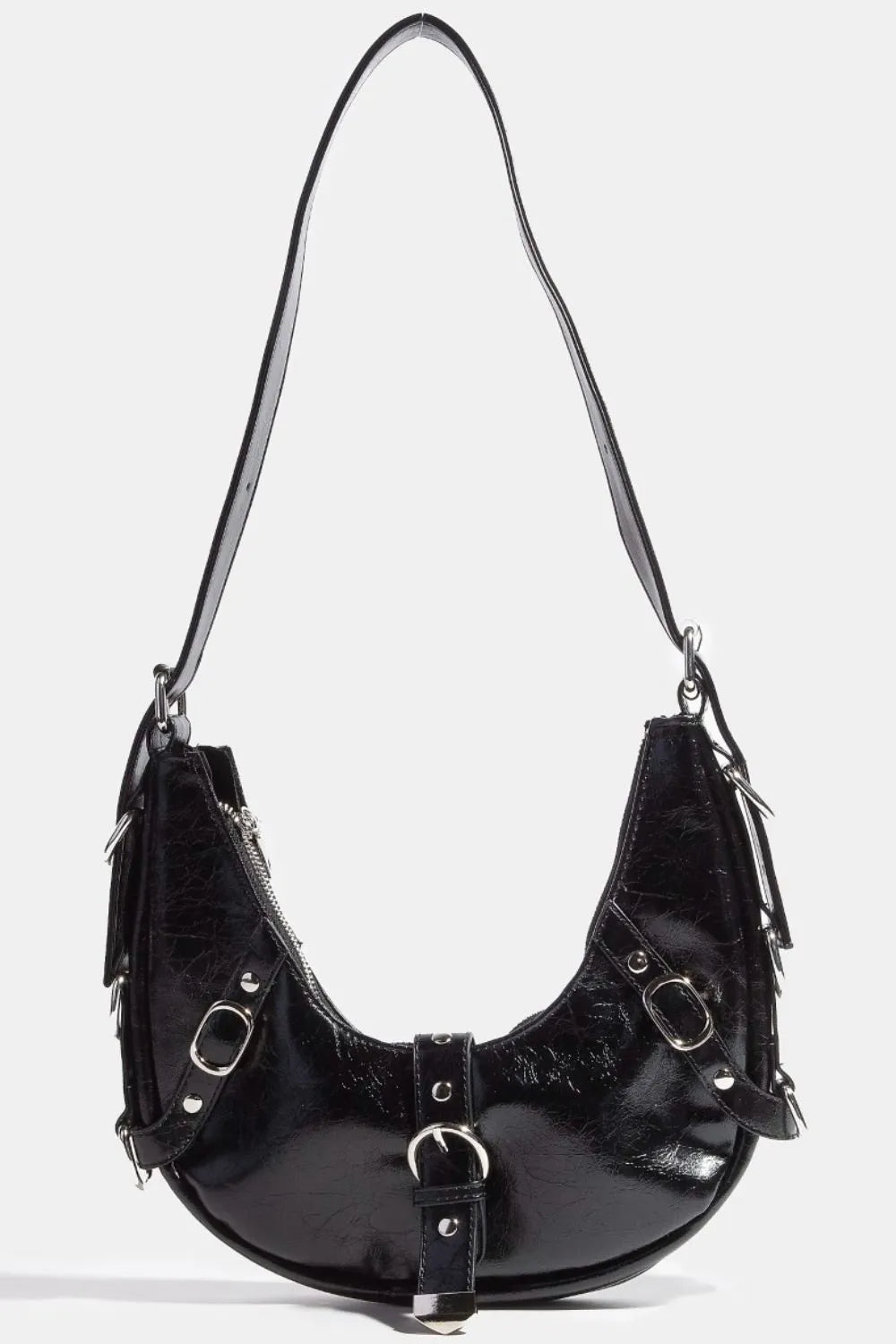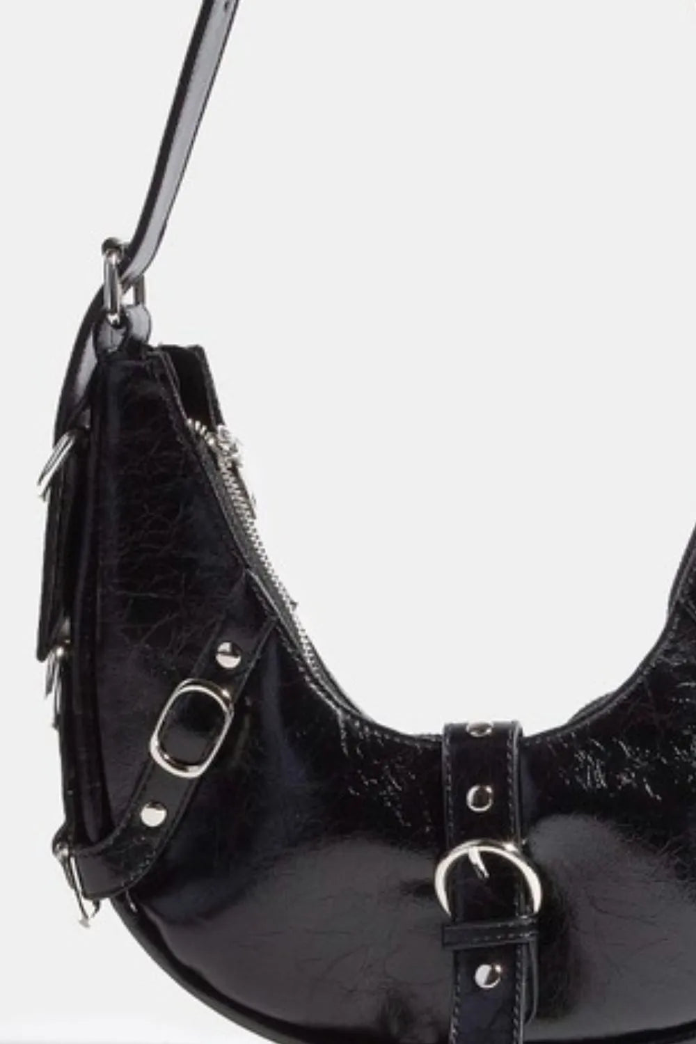 This striking Gothic-inspired shoulder bag features a distinctive crescent moon silhouette crafted from premium black leather. The bag showcases edgy metal hardware including decorative rings, buckles, and studs that add a rebellious touch to any outfit. The adjustable shoulder strap ensures comfortable wear while the structured design maintains its shape beautifully. Perfect for fashion-forward individuals who appreciate alternative style, this bag combines functionality with bold aesthetic appeal. The spacious interior provides ample room for daily essentials while the striking black leather exterior makes a powerful fashion statement.