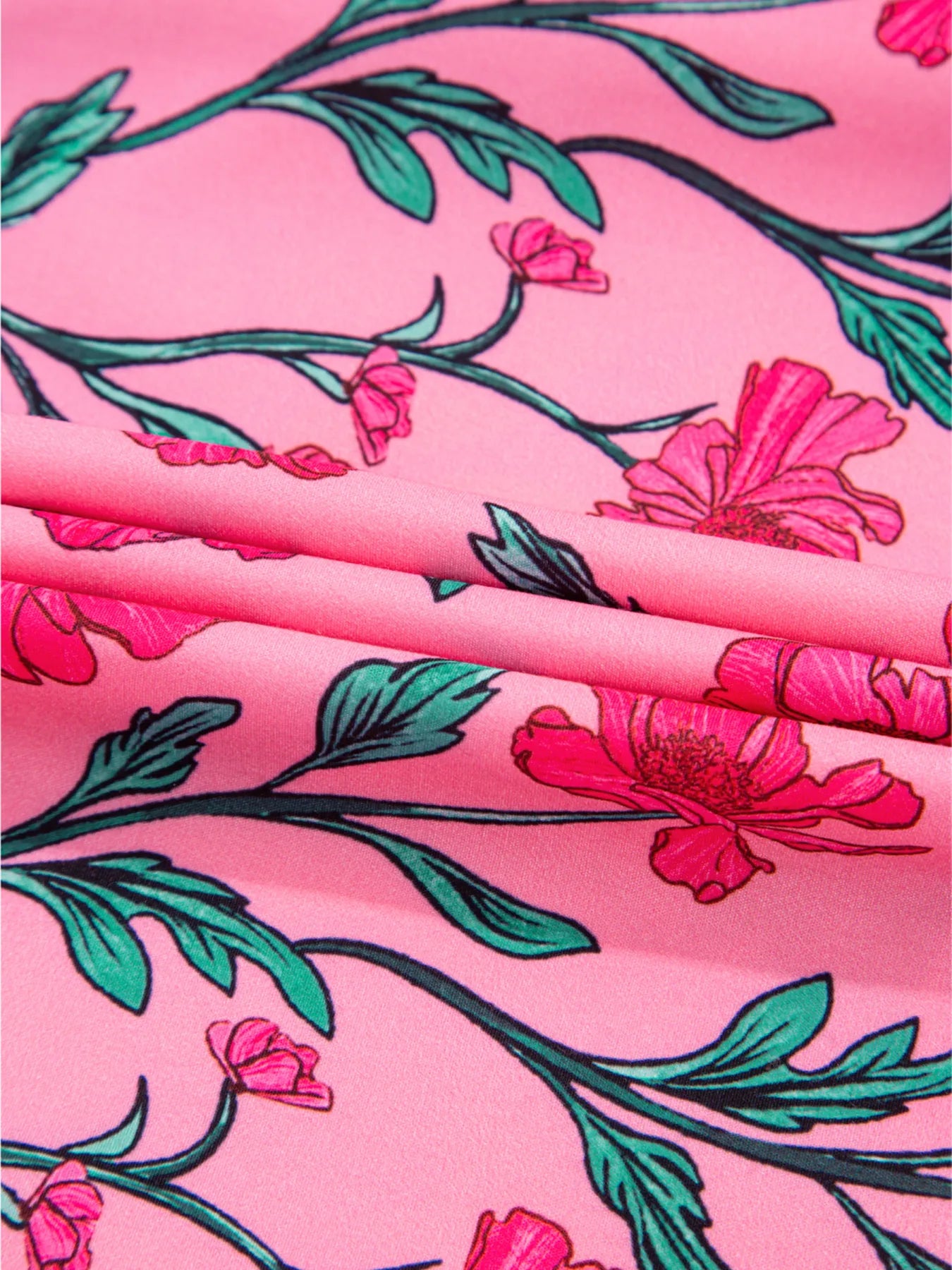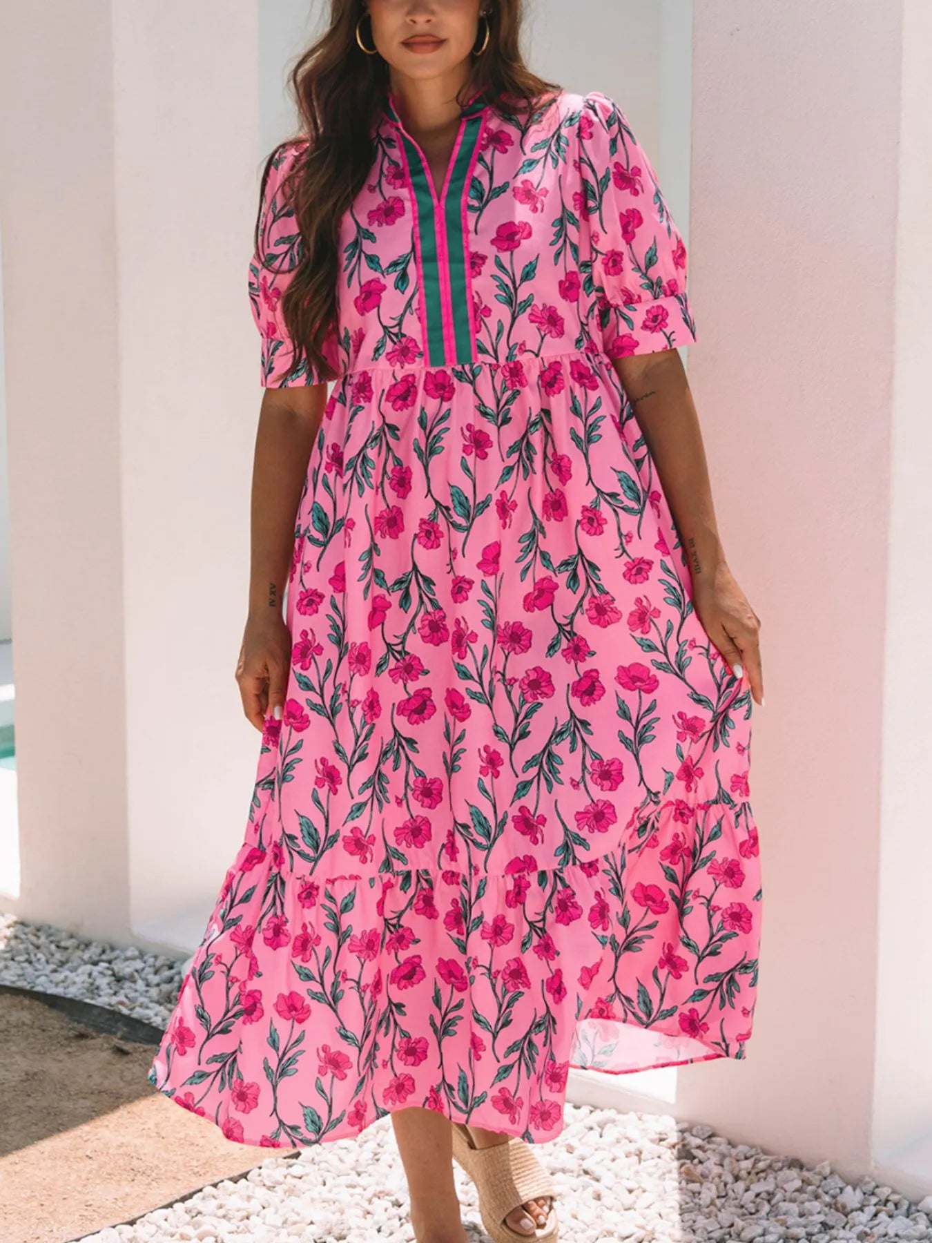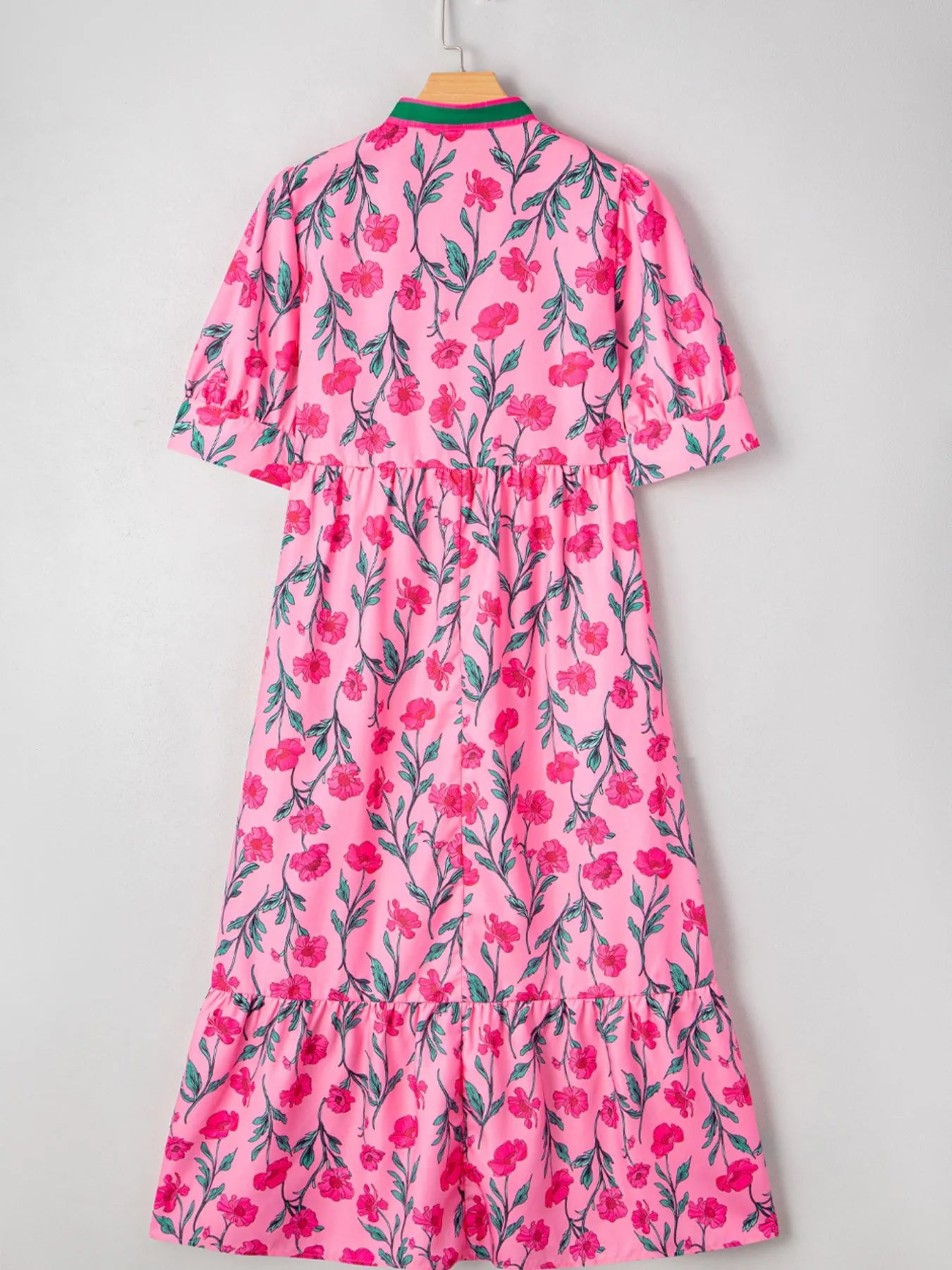 Floral Contrast Neckline A-line Puff Sleeve Dress
