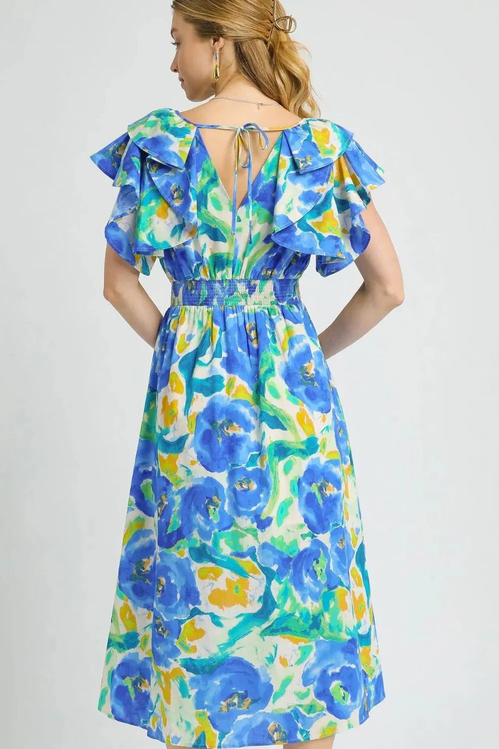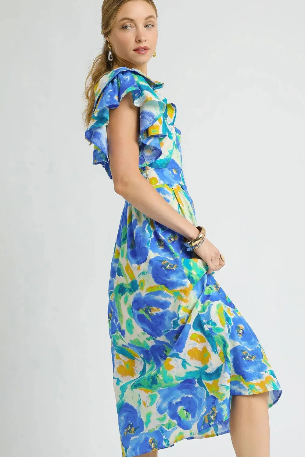 Umgee Floral Ruffled Cap Sleeve Midi Dress