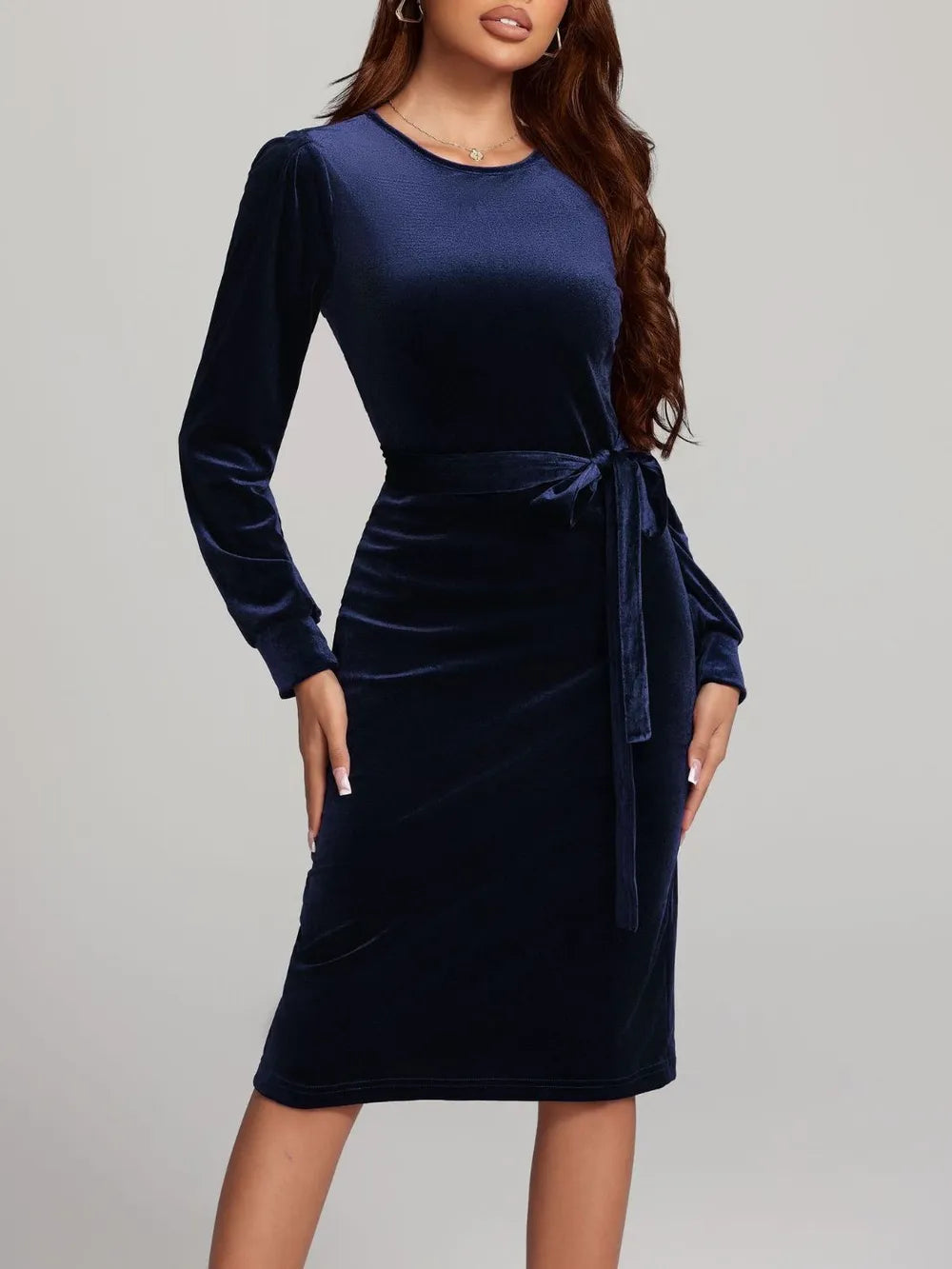 Round Neck Tie Waist Long Sleeve Velvet Dress