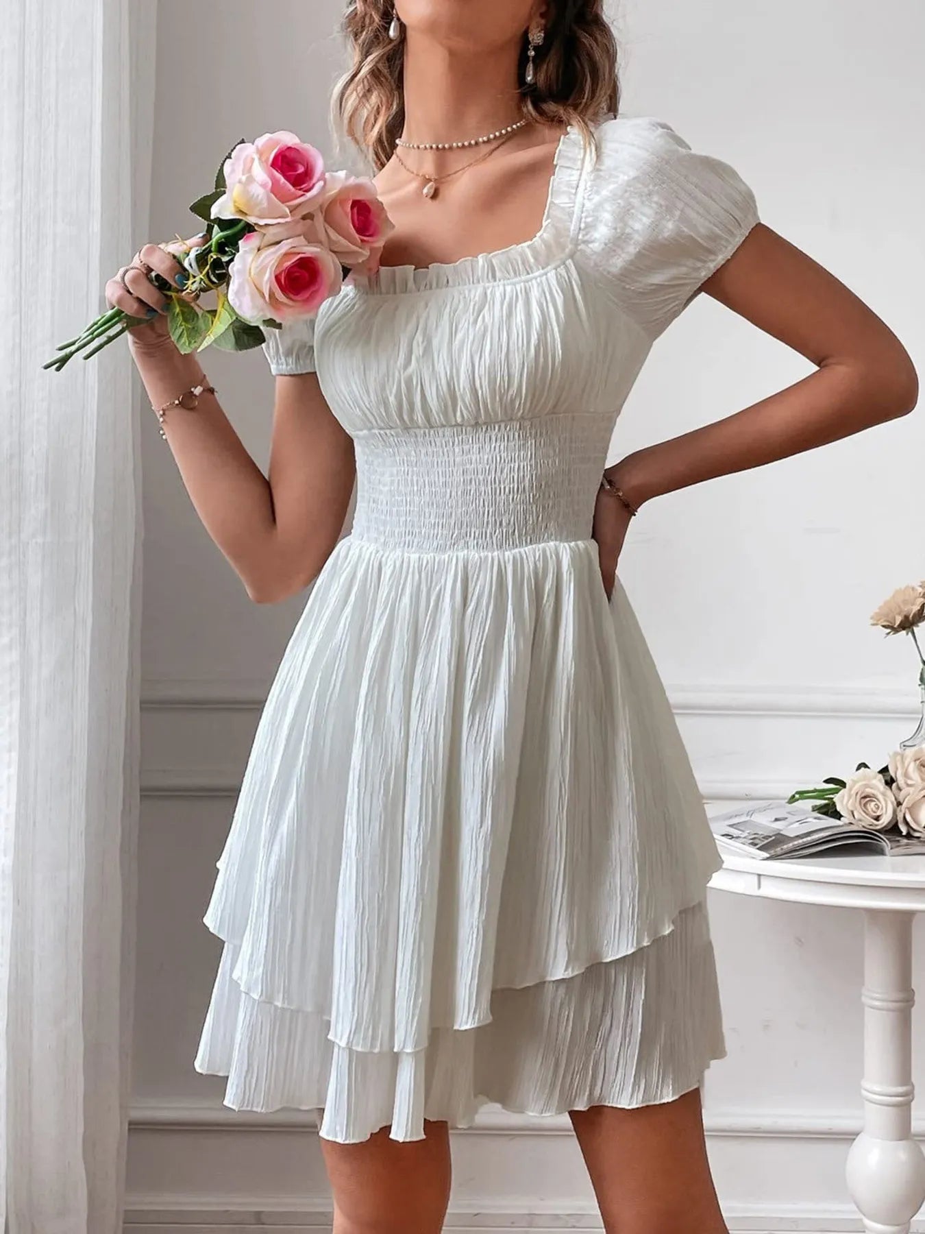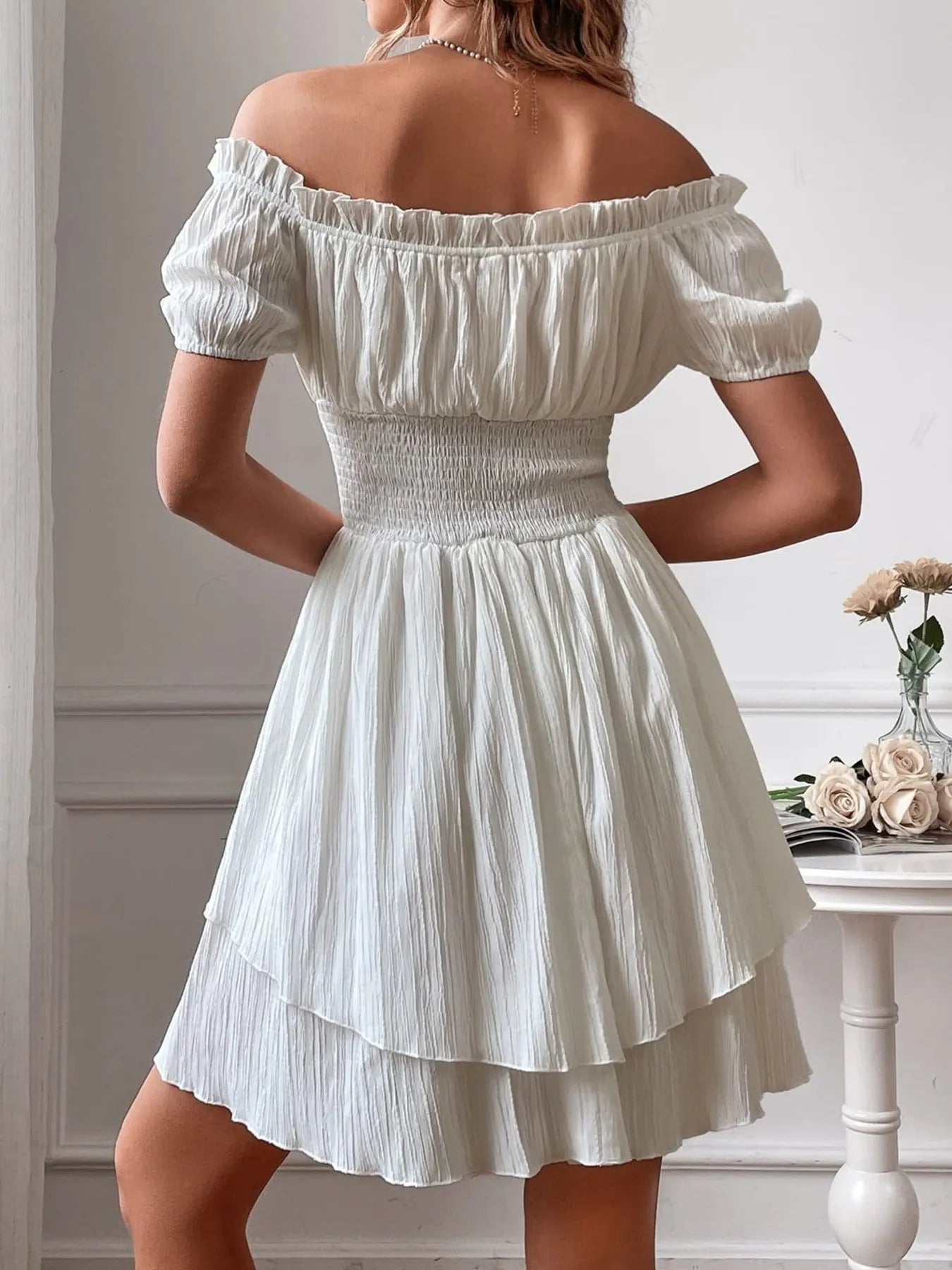 Off-Shoulder Smocked Waist Layered Mini Dress