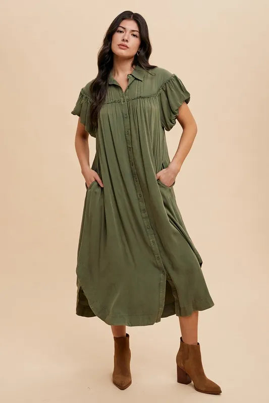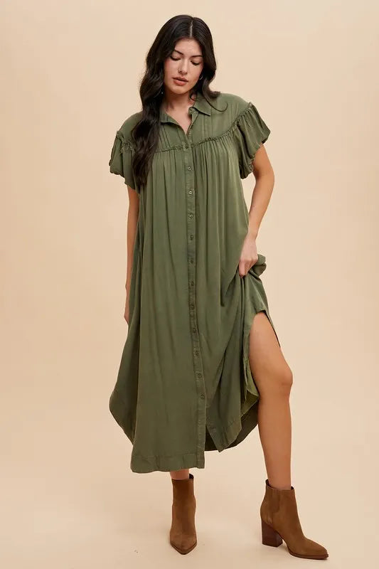Annie Wear Mineral Washed Button Down Puff Sleeve Shirt Dress