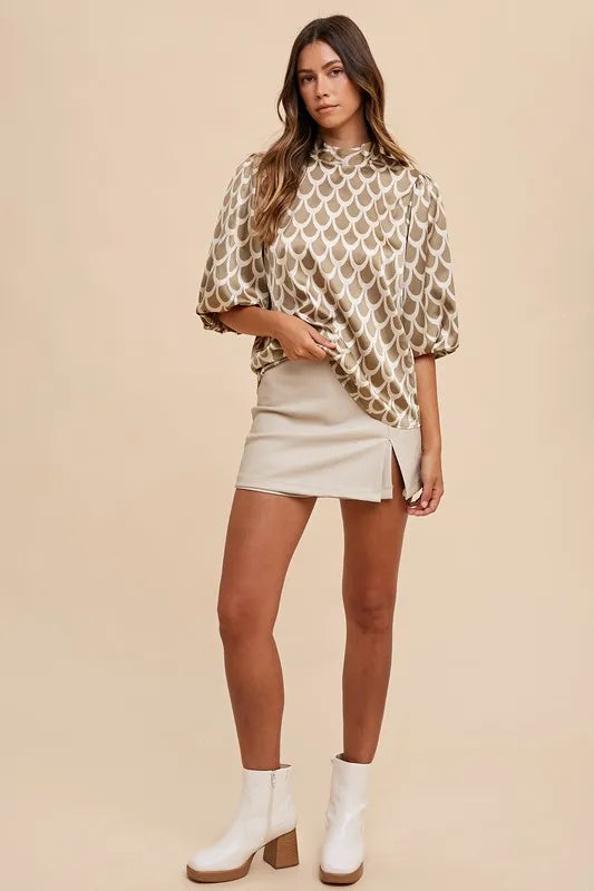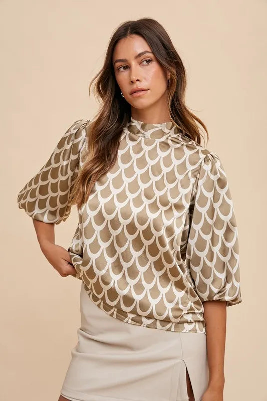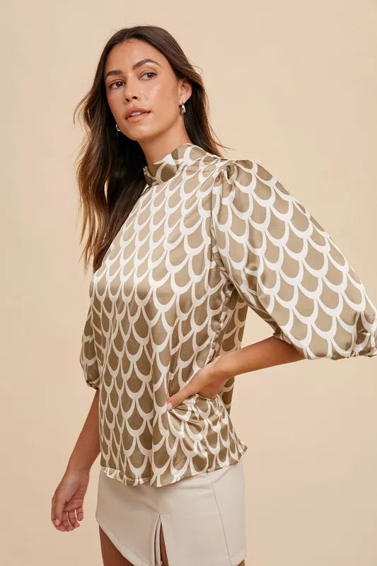 Annie Wear Tie Back Abstract Print Mock Neck Half Sleeve Blouse
