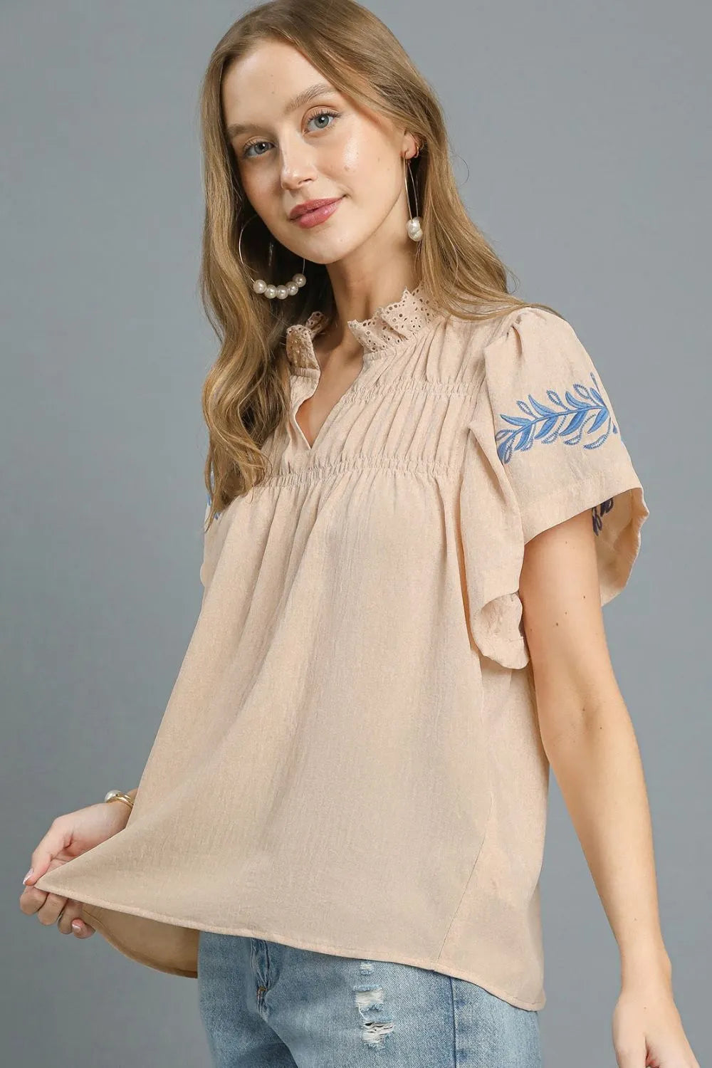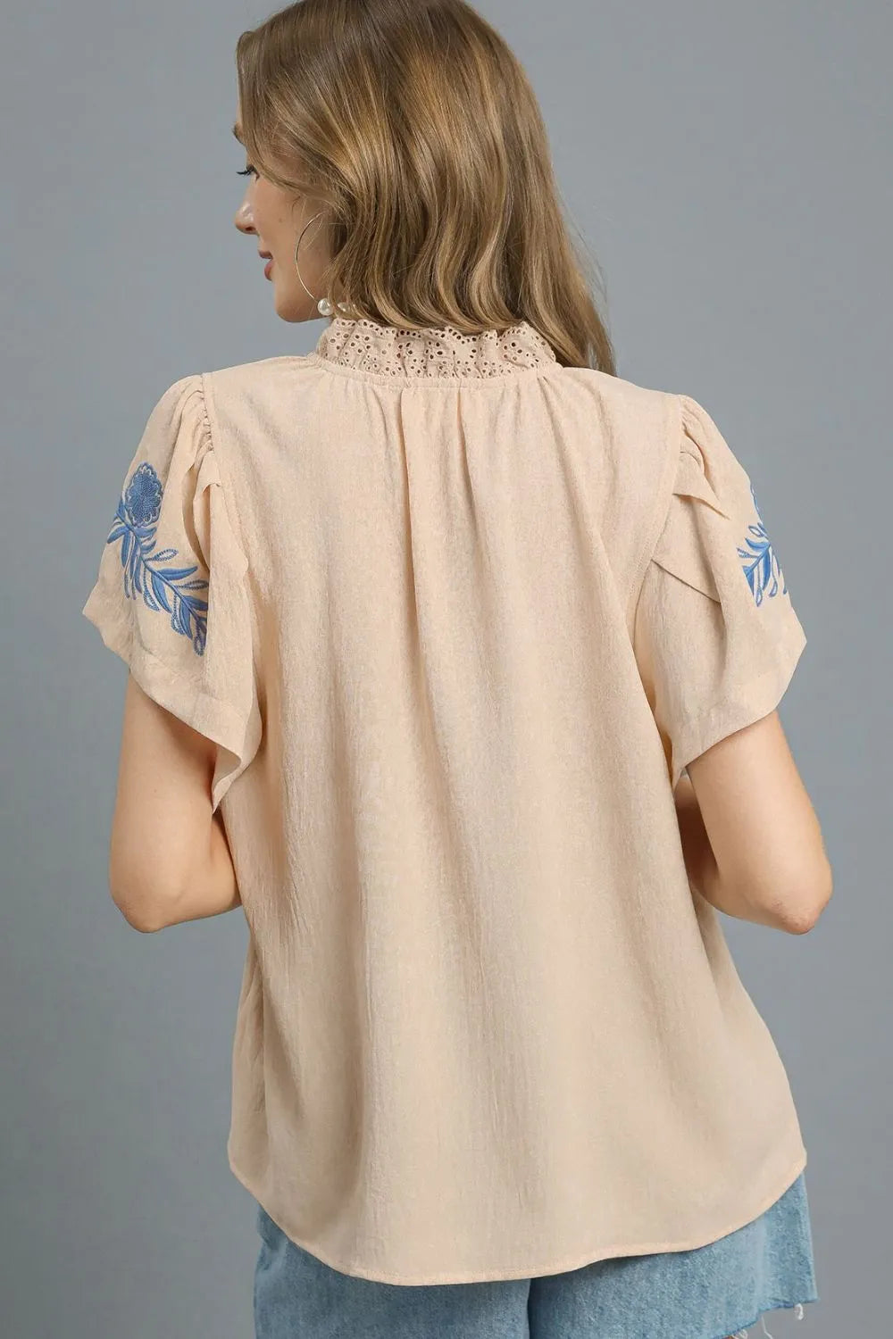 This charming peasant blouse features a romantic design with delicate flutter sleeves adorned with beautiful blue floral embroidery. Crafted from lightweight, breathable fabric in a versatile beige tone, it offers both comfort and style. The smocked elastic neckline creates a flattering gathered effect while ensuring easy wear. The relaxed fit and feminine silhouette make it perfect for casual summer days or dressed-up occasions. The boho-inspired design with embroidered details adds an artisanal touch to any outfit.